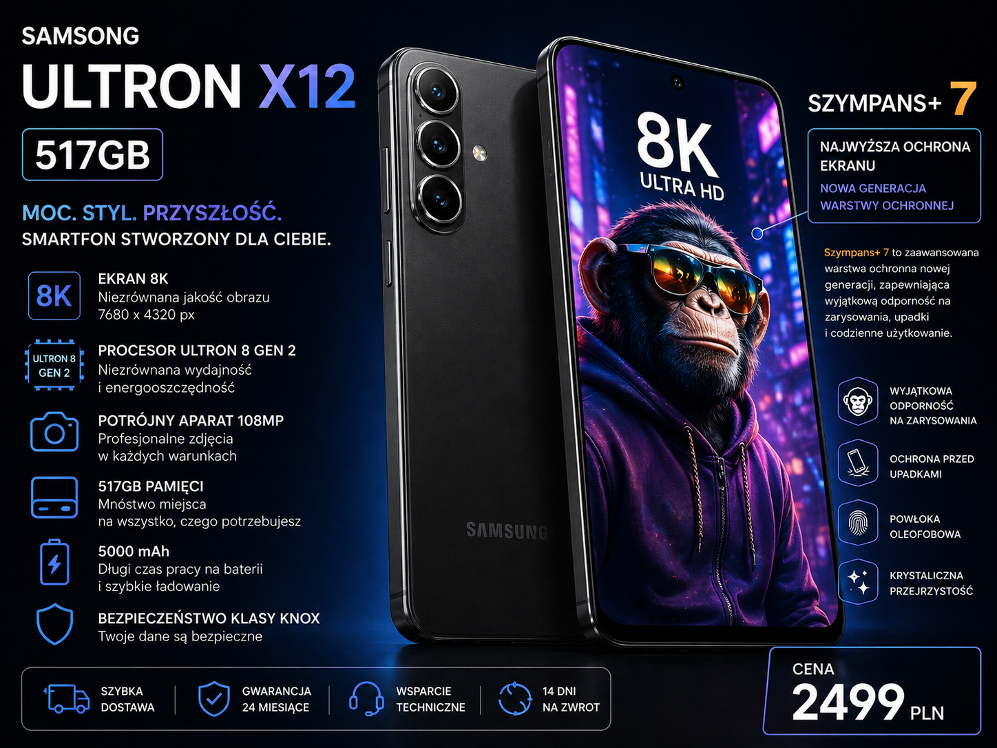 Nowoczesny smartfon Samsong Ultron X12 517GB z ekranem 8K, szybkim procesorem oraz ochroną ekranu Szympans+ 7.